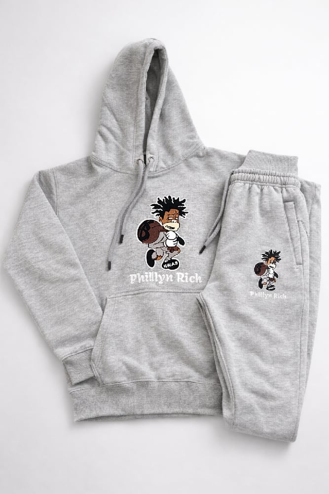 Unveil a unique blend of style and comfort with our heather gray sweatsuit. This eye-catching set features an intricately embroidered logo of a black cartoon figure dressed in distressed clothing, holding a money bag.